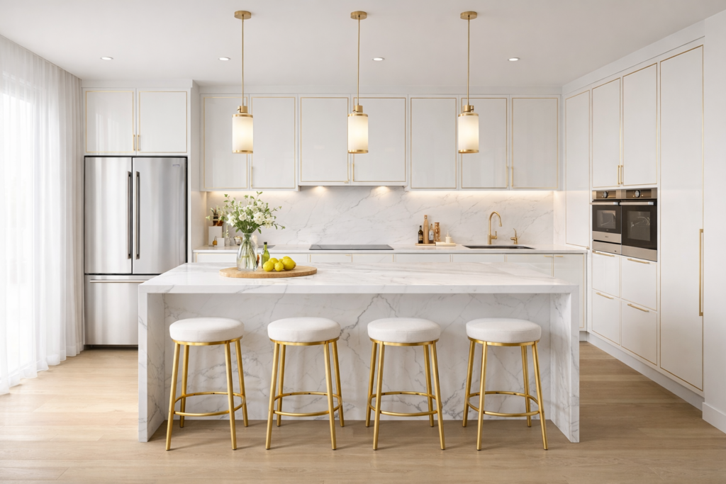 Modern kitchen renovation including layout improvements, tiling, lighting and installation of high-quality cabinets and finishes designed for everyday functionality.